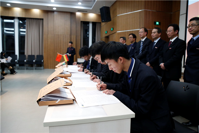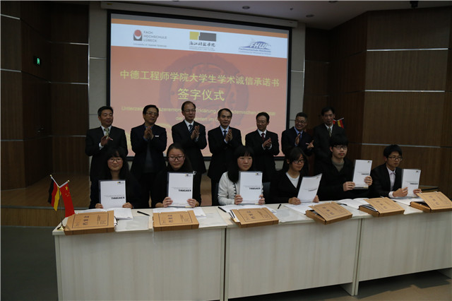 在学生代表引领全体学生用中德文庄严宣誓后,每一位学生都上台在领导和师长们的见证下,在承诺书上认真签下了自己的名字。