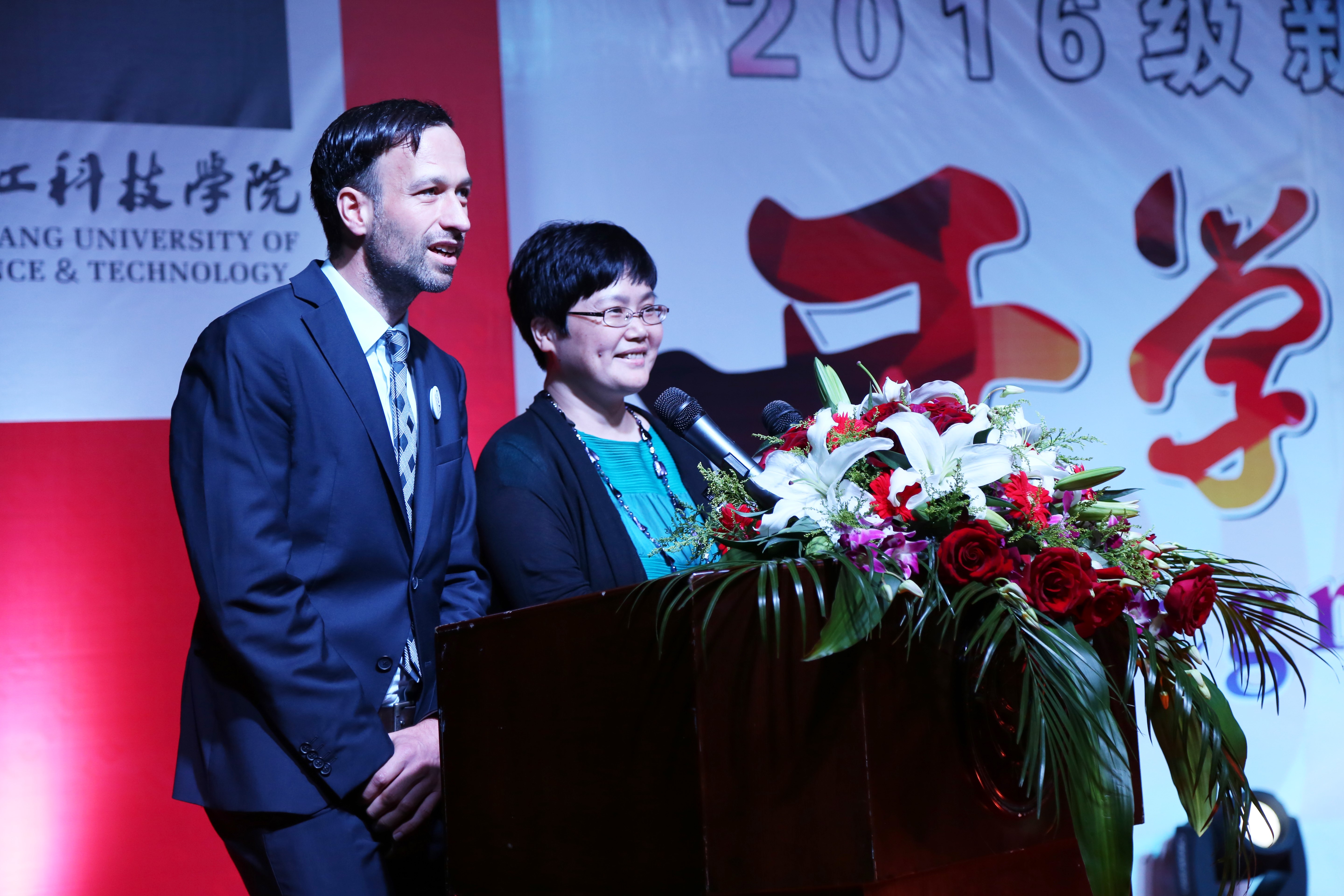 2016年11月6日晚,浙江科技学院av片 2016级新生开学典礼在浙江科技学院安吉校区中德楼隆重举行。德国西海岸应用科技大学校长哈诺·科尔希(Hanno Kirsch)、吕贝克应用科技大学副校长约翰森·利兹(Joachim Litz)、我校校长叶高翔、副校长冯军、副校长郑友取、校长助理鲁伟权出席。av片 领导、学校相关职能部门领导、中德双方教师、学院老生代表和学院全体16级新生近200人参加此次盛会。