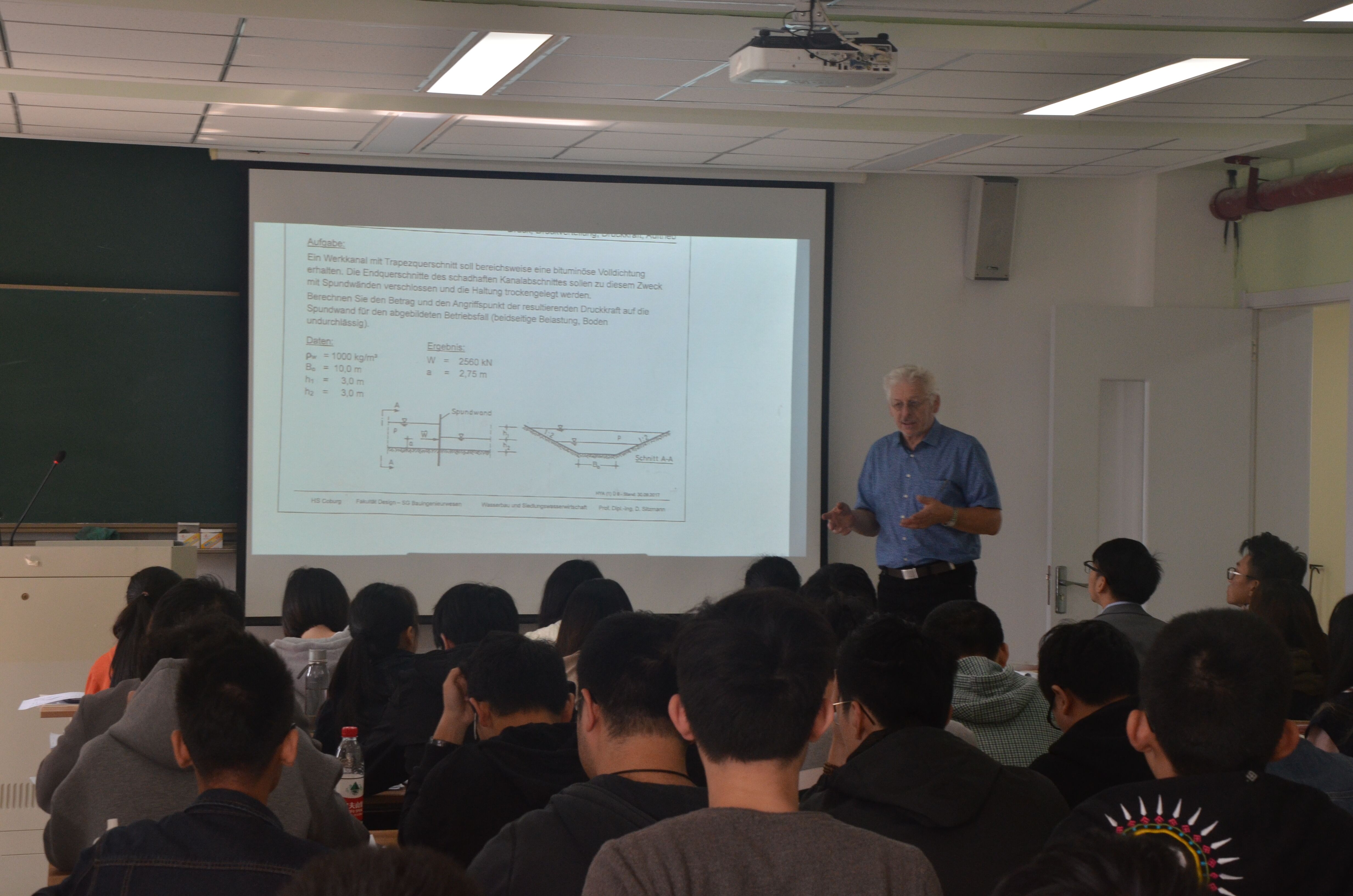 10月23日上午,来自德国科堡应用科技大学的迪特尔•舒兹曼教授开始为av片 15级土木的同学讲授为期两周的《流体力学》课程。这是15级土木专业的同学们第一次经历的德方教授集中授课,同学们非常重视这次集中授课,部分同学在暑假就花时间查询整理了该门课程的相关德语专业词汇,以便于更好地理解这门课程。