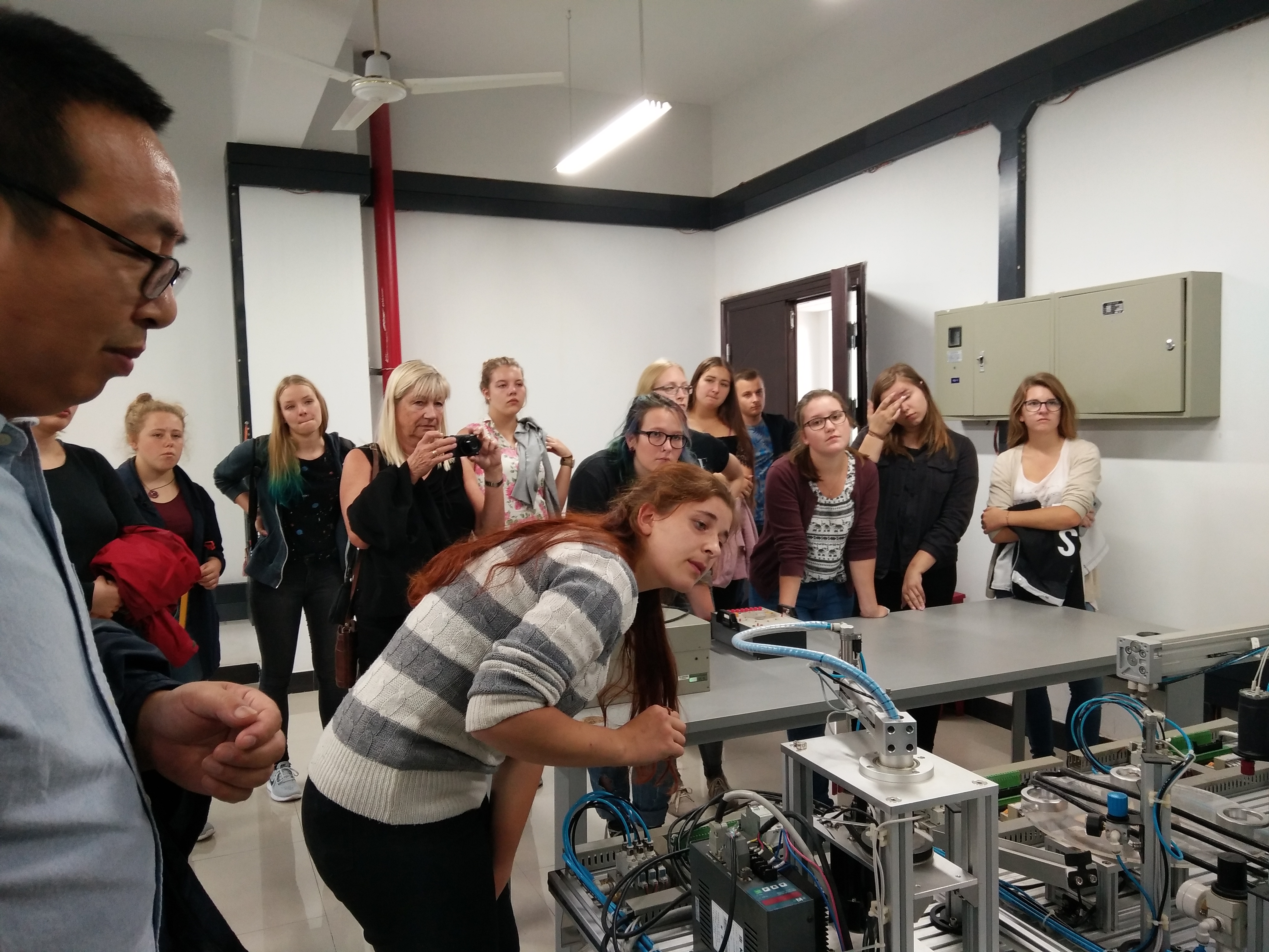 10月13日下午,av片 实验室工程师杨志卫带领学生代表团参观电气及其自动化专业的实验室,德国学生对自动化技术产生非常浓厚的兴趣,部分学生甚至主动参与设备演示与讲解。之后,av片 实验室工程师沈潇扬带领学生团参观土木专业的沥青实验室,向大家解释设备的运行方式和原理。最后,由av片 外事秘书吴一婷带领学生代表团参观中德合作馆,向德方代表团展示了我校中德合作历程和合作成果,参观期间德方教师和学生提问了很多关于学校专业设置、学生宿舍、实验室规模等问题。本次交流为av片 接收德国学位生打下了良好的基础。