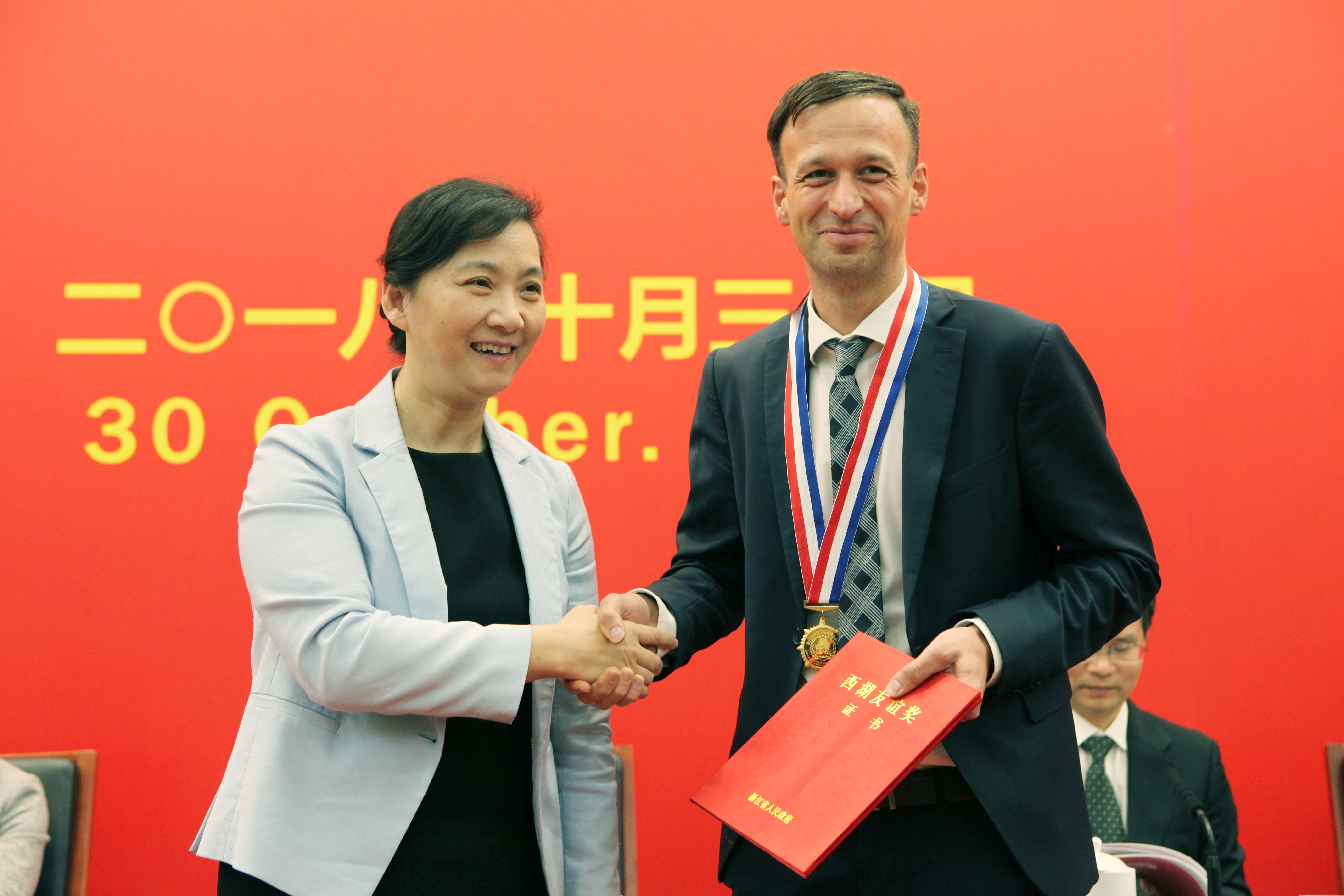 10月30日下午,2018年浙江省政府“西湖友谊奖”颁奖大会在省人民大会堂举行。该奖是浙江省该奖是浙江省人民政府为表彰外籍专家在浙江省经济建设和社会发展中所做出的突出贡献和奉献精神而设立的最高奖项,av片 教学院长、德国吕贝克应用科技大学建筑结构教授弗兰克•肯普教授接受了表彰,省委副书记、省长袁家军亲自会见50名获奖外国专家,副省长王文序为获奖专家颁奖。肯普教授为我校第7位获此荣誉的外国专家。