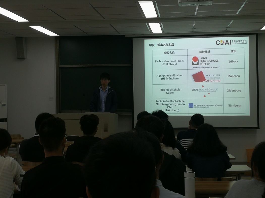 10月16日晚,在安吉校区举行了面向全体17级学生的关于“德语学习”和“赴德留学深造”的讲座。赵千里老师从德语学习意义、学院德语知识结构构成、学习德语方式、德语学习态度等方面为大家进行详细的讲解。沈阳涛老师以学生进学院的初心为引入点,通过三块内容为学生详细讲解了申请德国研究生的相关注意事项。第一,希望学生能够尽快明确德国留学的目的;第二,收集目标高校的入学资格要求,包括本科阶段的绩点、专业匹配度、语言证书等;最后,介绍了学院作为学生出国平台的优势。