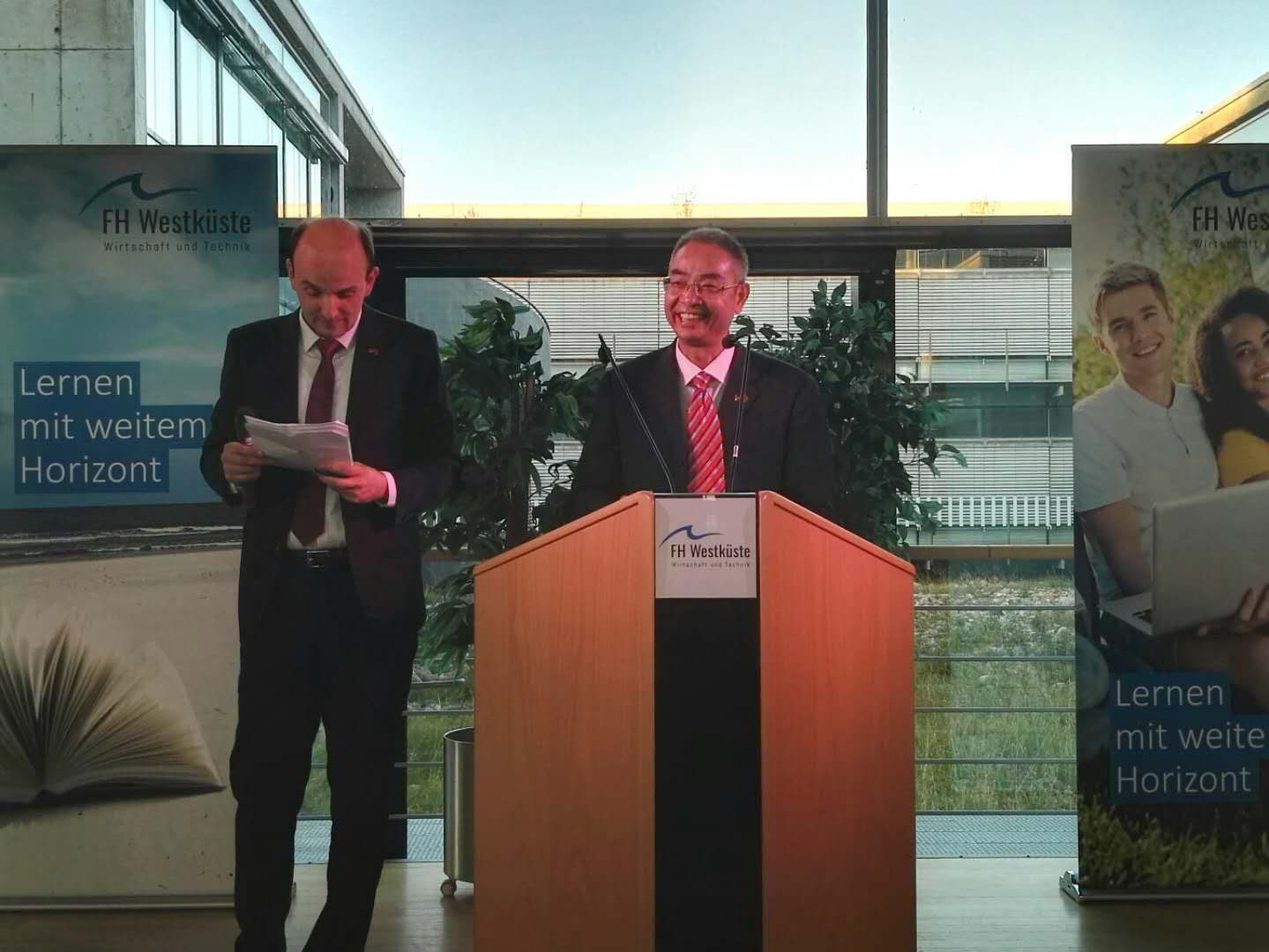 10月11日,校党委书记龚建立与av片 院长徐理勤受邀出席av片 电气专业德国合作高校——西海岸应用科技大学的25周年校庆。龚建立书记作为该校国外合作院校代表致辞,他对两校前期的合作予以高度肯定,并畅想两校未来发展的美好前景。此外,德国石荷州能源农业环境自然和数字化部长艾尔布莱希(Jan Philipp Albrecht)先生,Ditmarschen大区行政首长戴特勒夫斯(Ute Borwieck-Dethlefs)女士,海德市市长史都恩(Michael Stumm)先生等在致辞中对西海岸应用科技大学的国际合作,特别是与我校共建av片 给予了充分的肯定和高度的评价。