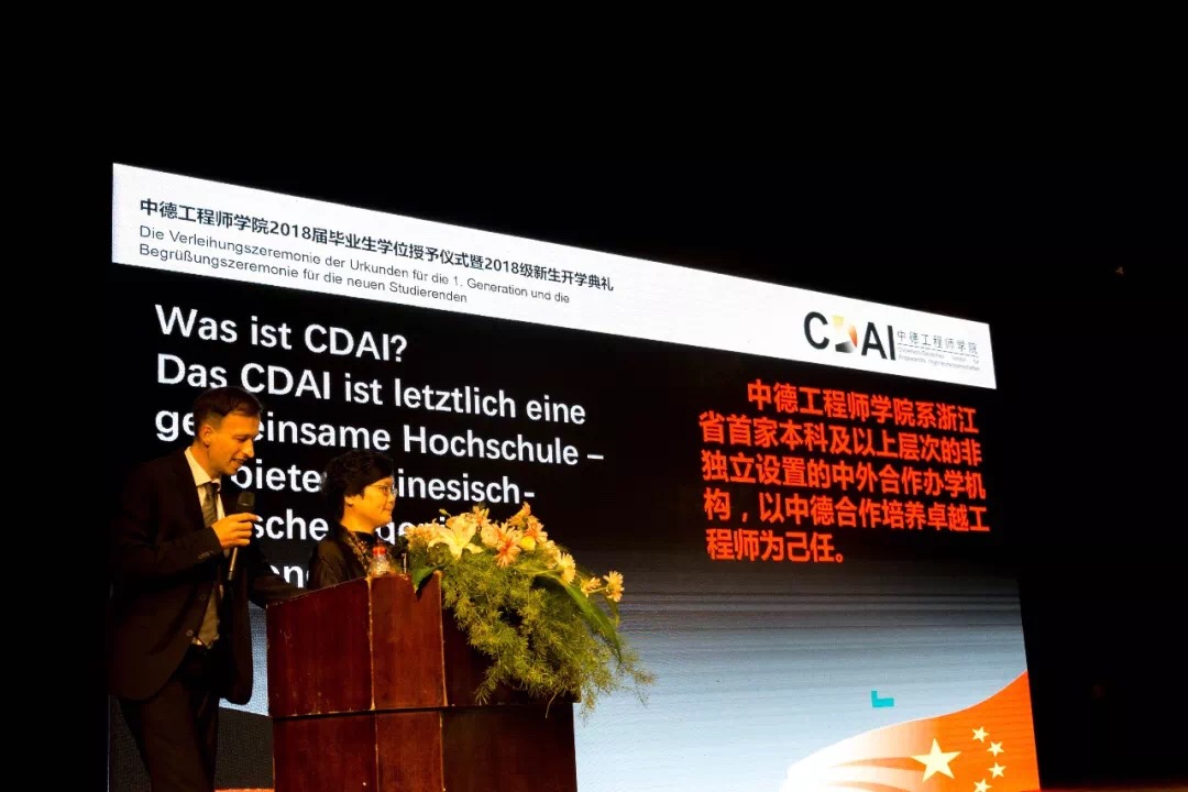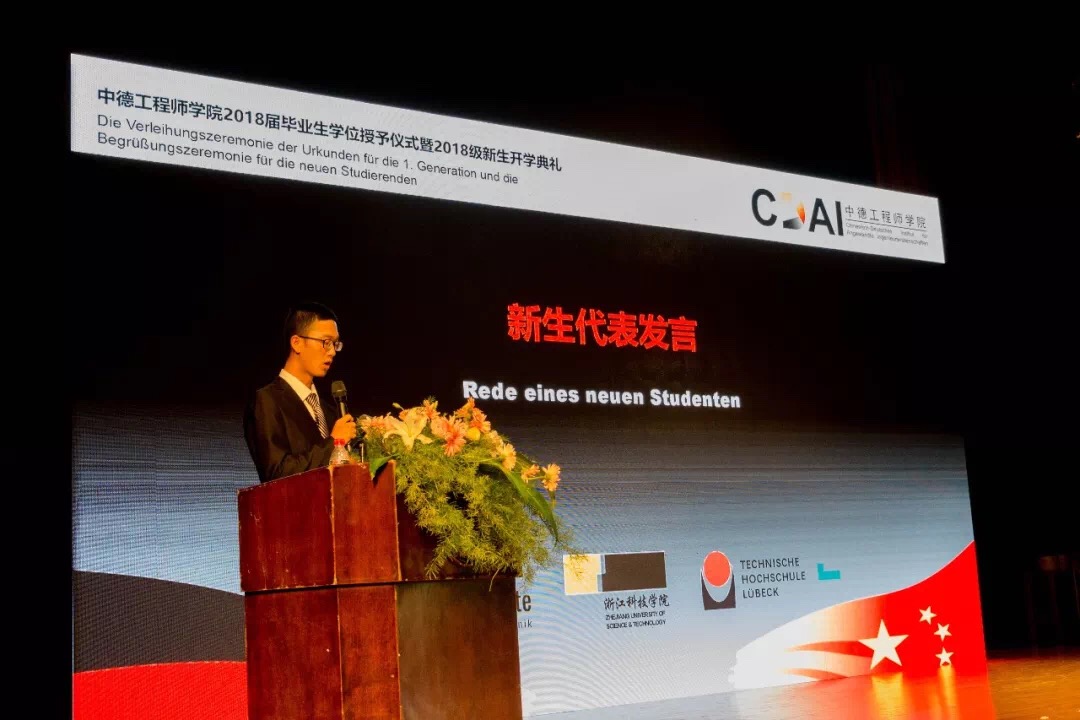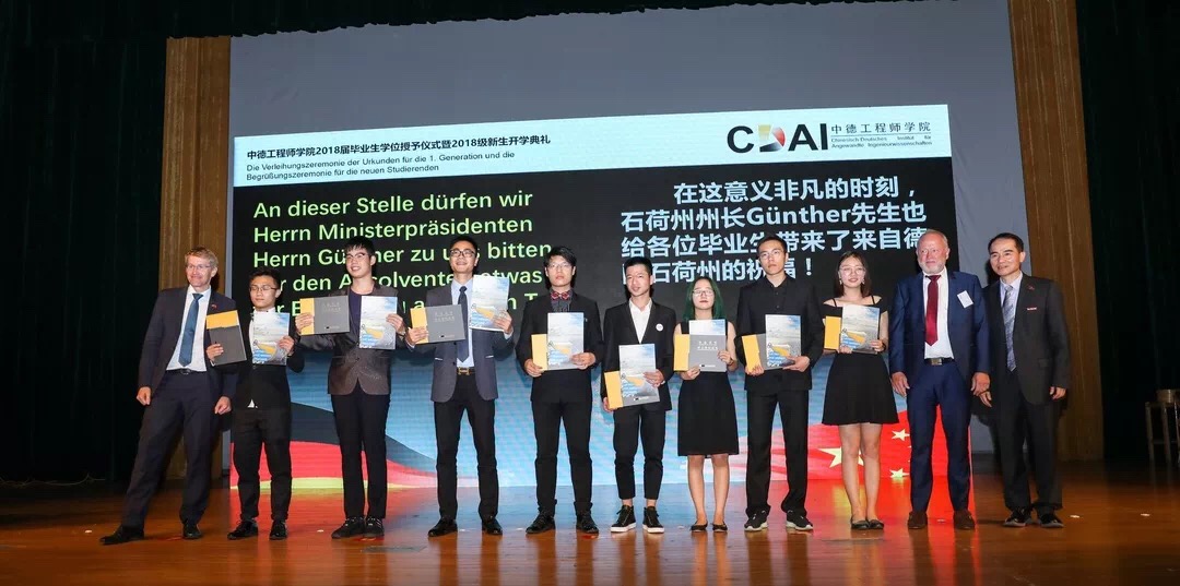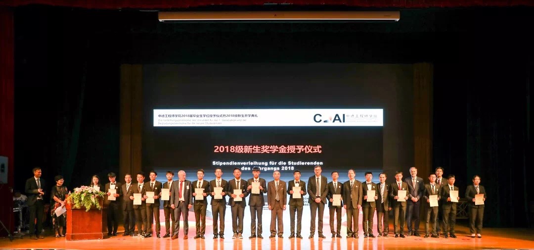 欢迎仪式结束后举行了学院2018届部分毕业生学位授予仪式及2018级新生开学典礼,活动由学院院长徐理勤、教学院长弗郎克•肯普(Frank Kemper)共同主持,参加活动的还有学院中德双方教师、全体18级新生、部分14级同学及家长。校长叶高翔与西海岸应用科技大学工程学院院长德特勒夫•廷森(Detlef Jensen)向av片 18届部分毕业生颁发中德双学位证书,同时君特先生为毕业生佩戴徽章并赠送礼物。党委副书记赵东福宣读获得2018级新生奖学金名单,中德双方领导为获奖者颁奖。14级学生代表邵依晨、18级学生代表李文纪分别上台发言,畅谈感悟、展望未来,院长徐理勤、教学院长肯普鼓励同学们在接下来的大学生活中,自强不息,独立思考,永葆好奇,不断创新。