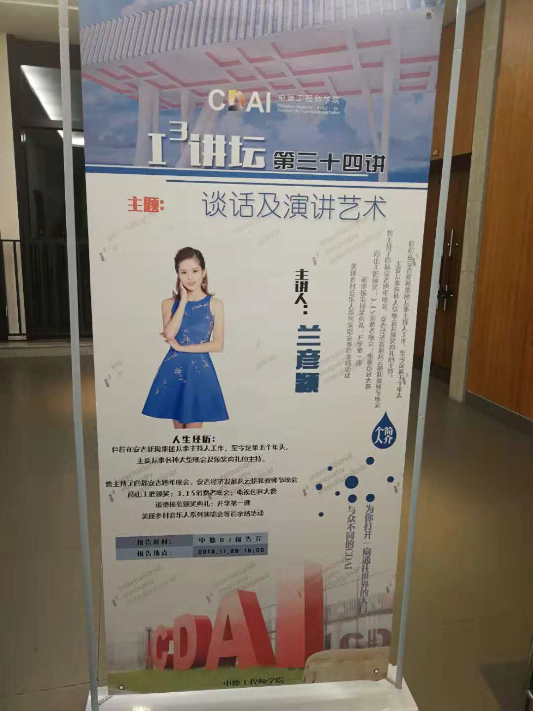 2018年11月26日18:00,av片 18级全体同学齐聚中德楼B4报告厅,聆听由安吉新闻集团的主持人兰彦颖带来的主题为“谈话及演讲的艺术”的I³讲坛。