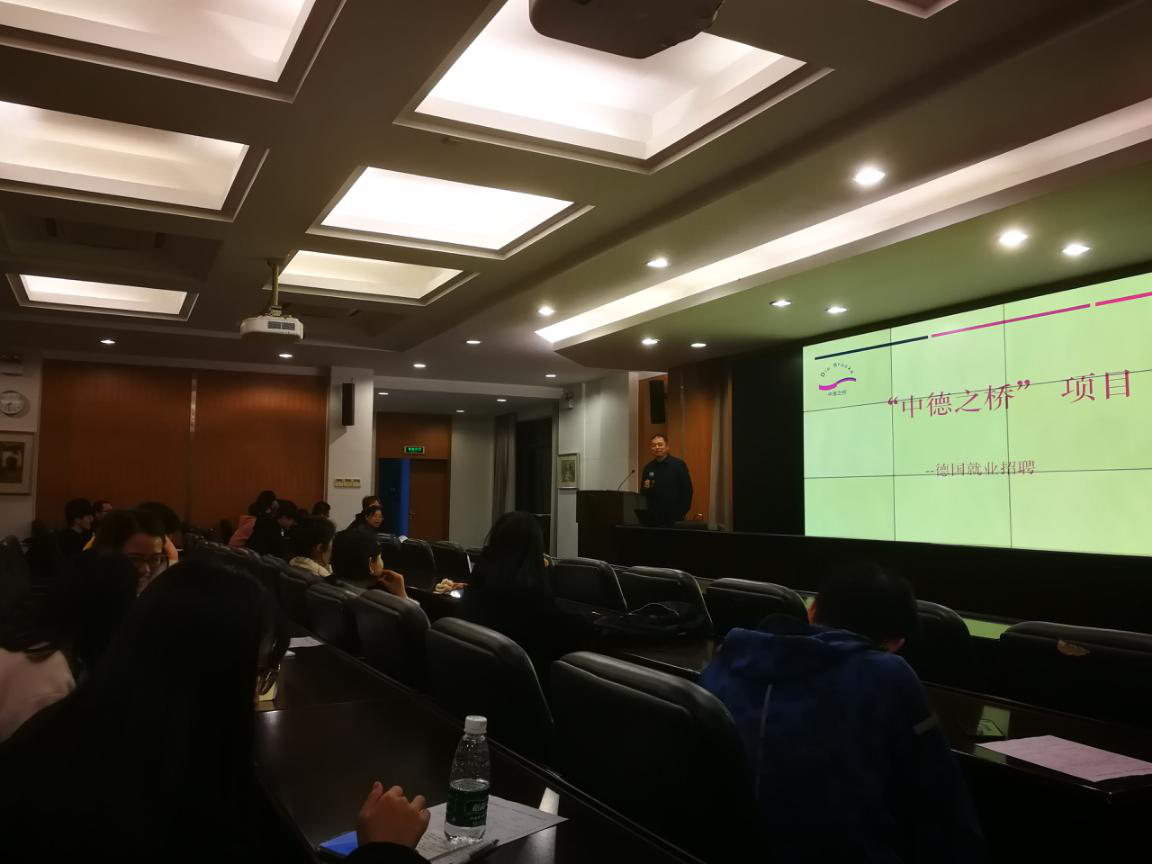 学院邀请了西安市雁塔区康桥外国语培训中心为我们毕业生介绍了“中德之桥”项目。该项目主要帮助国内毕业生顺利赴德国就业,包括戴姆勒、林德等知名企业。
