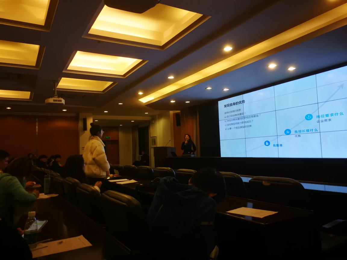 学院还邀请了一位具有16年以上人力资源工作经历、现任海明控股集团高级人力资源经理的Tina老师为我们的毕业生做了一次深入浅出的经验分享,她结合自身工作实际详细地介绍了应聘者在简历制作、求职面试等过程中应注意的事项并做了相应的指导。讲座过程中同学积极参与互动,进行实战操练,身临其境的体验求职过程。