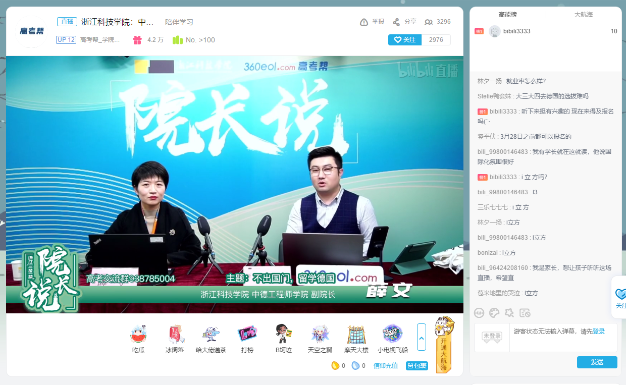 2021312日,学校与360教育在线高考帮合作开展三位一体招生宣传“院长说”直播活动,av片 副院长薛文做了题为“不出国门,留学德国”的人才培养方案介绍,与主持人互动并详细解答了考生比较关注的关于学院的一些问题,吸引了众多考生家长驻足观看。