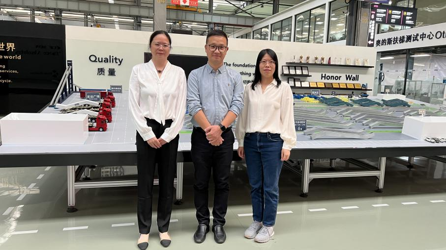 马杭育详细介绍了企业发展史以及数字化技术全方位赋能企业的成果和成效,陪同参观了奥的斯嘉兴生产基地。范佳静介绍了学院中德合作办学下工业工程专业特色,吕海萍介绍了经管工业工程专业近10年的发展以及新文科专业认证情况,两个学院工业工程专业虽各有特色,但一直保持着优势互补、紧密合作关系,特别是在课程设置、人才培养模式与企业的紧密贴合上。随后双方围绕校企协同培养符合产业、行业、企业用人需求的工业工程专业人才等问题展开深入探讨,就企业参与人才培养全过程方式,如参与人才培养方案制定、始业教育、课堂教学、实践教学、学科竞赛等可能性达成一定的共识,为未来更广阔校企深入合作打下基础,同时也更好地促进了两个学院工业工程专业的协同发展。