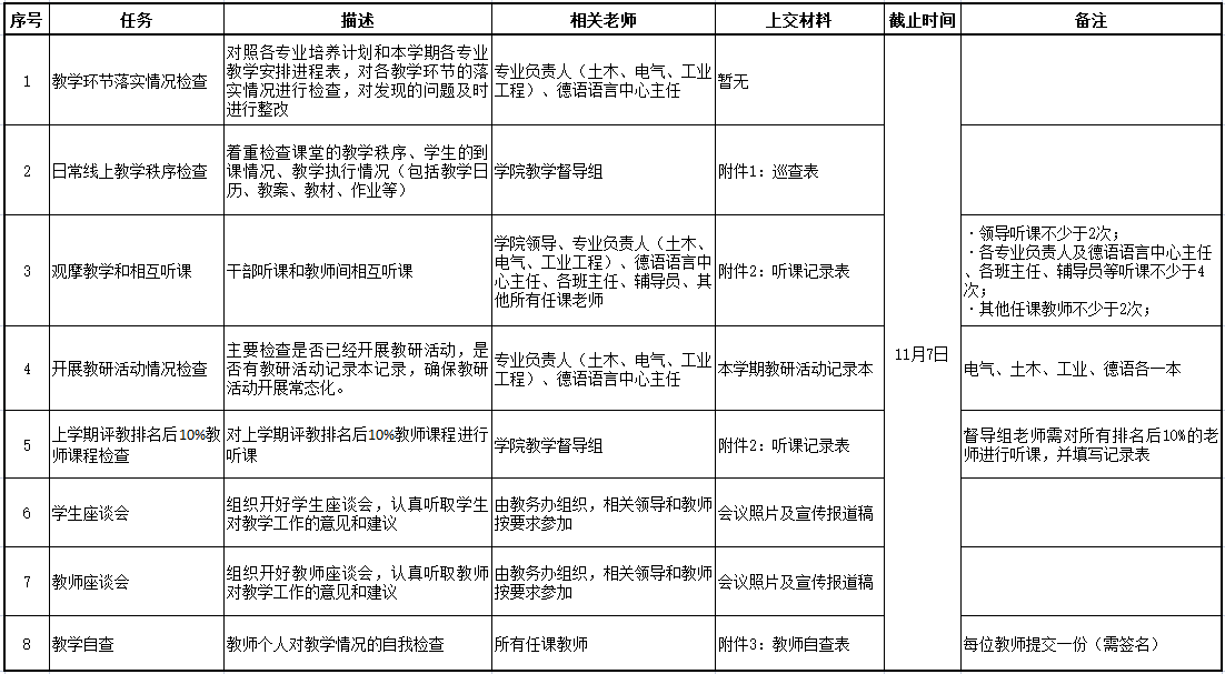 学校定于第8周、第9周(10月24日~11月4日)进行期中教学检查。现将av片 期中教学检查任务分配如下表,请老师们按要求及时完成任务并将相关材料电子版发送至[email protected]