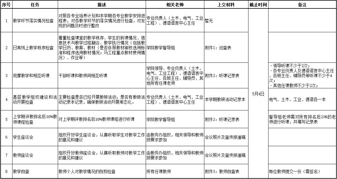 学校定于第9周、第10周(4月17日~4月30日)进行期中教学检查。现将av片 期中教学检查任务分配如下表,请老师们按要求及时完成任务并将相关材料电子版发送至邮箱[email protected]