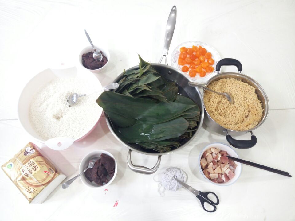 (▲粽叶、蛋黄、豆沙、咸肉以及糯米)