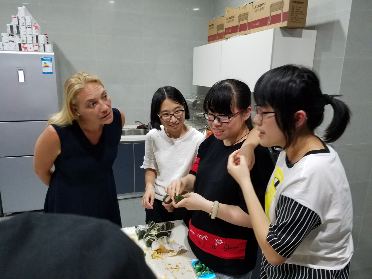 现场有包粽子娴熟的“能手”,也有从未包过粽子的“新手”,路过的老师们也积极地加入进来,给同学们“指导”正确方法,外教Frau Kurz也主动尝试了包粽子的挑战。大家边聊天、边包粽子,还不时用德语讨论粽子的来历、包法、馅料以及各地的区别。