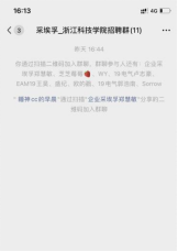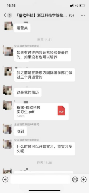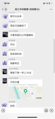 在线上招聘会环节,各个企业分别在各自的招聘微信群中答疑并接收同学们的简历,也有很多同学选择直接和企业宣讲人线上面对面沟通。