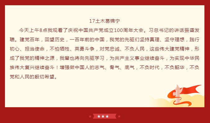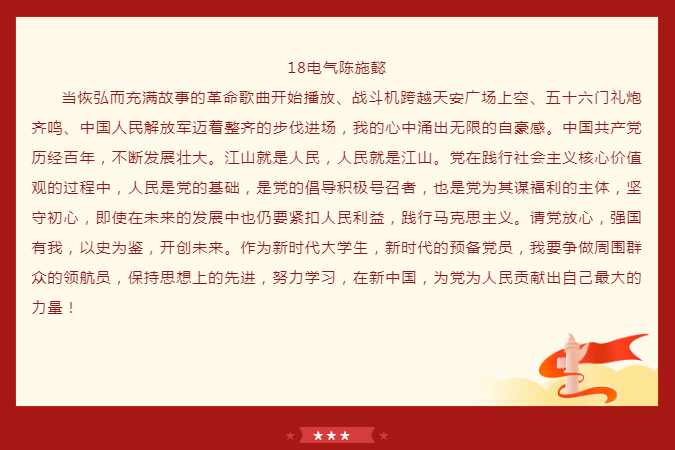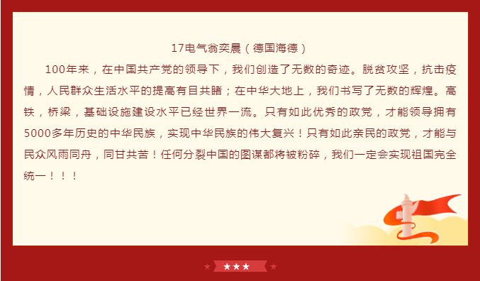 学院师生党员通过实时观看,对“没有共产党就没有新中国”有了更深刻的体会,纷纷表示心中有信仰,脚下就有了力量。中国共产党披荆斩棘,经风雨,战胜一次又一次艰难险阻,迎来如今的辉煌。作为党的一份子,行动上要自觉将学习、工作与国家的命运结合起来。范佳静书记表示,作为av片 直属党支部书记,将继续弘扬伟大的中国共产党精神,不断加强学院党建引领作用,推动学院内涵式发展,办好中德深度融合的av片 ,为培养一批批具有国际化、应用型工程背景的社会主义建设者和接班人而努力。“青年强则中国强”,她希望在座的青年学子们认真学习习近平总书记重要讲话精神,不断坚定理想信念、增强学识本领,把青春奋斗融入党和人民事业中。德国西海岸的学子们观看完大会回放后感慨到,生在这个伟大的时代,作为一名中国人无比骄傲。身处异国他乡的他们,更能感受到祖国的强大和温暖,也将坚定地听从党的召唤,祖国和人民的召唤,继承这份意志,将党员精神发扬光大。